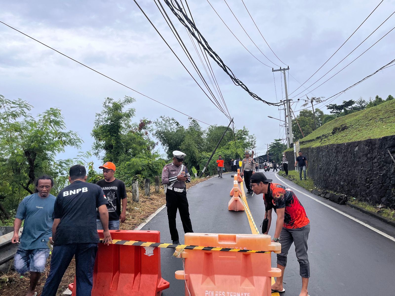 Personel Kepolisian dari Polres Ternate gerak cepat mengamankan lokasi tanah longsor di Jalan Santo Pedro, Kelurahan Ngade, Kecamatan Ternate Selatan, Kota Ternate, akibat hujan deras yang mengguyur Kota Ternate, Kamis (19/6).