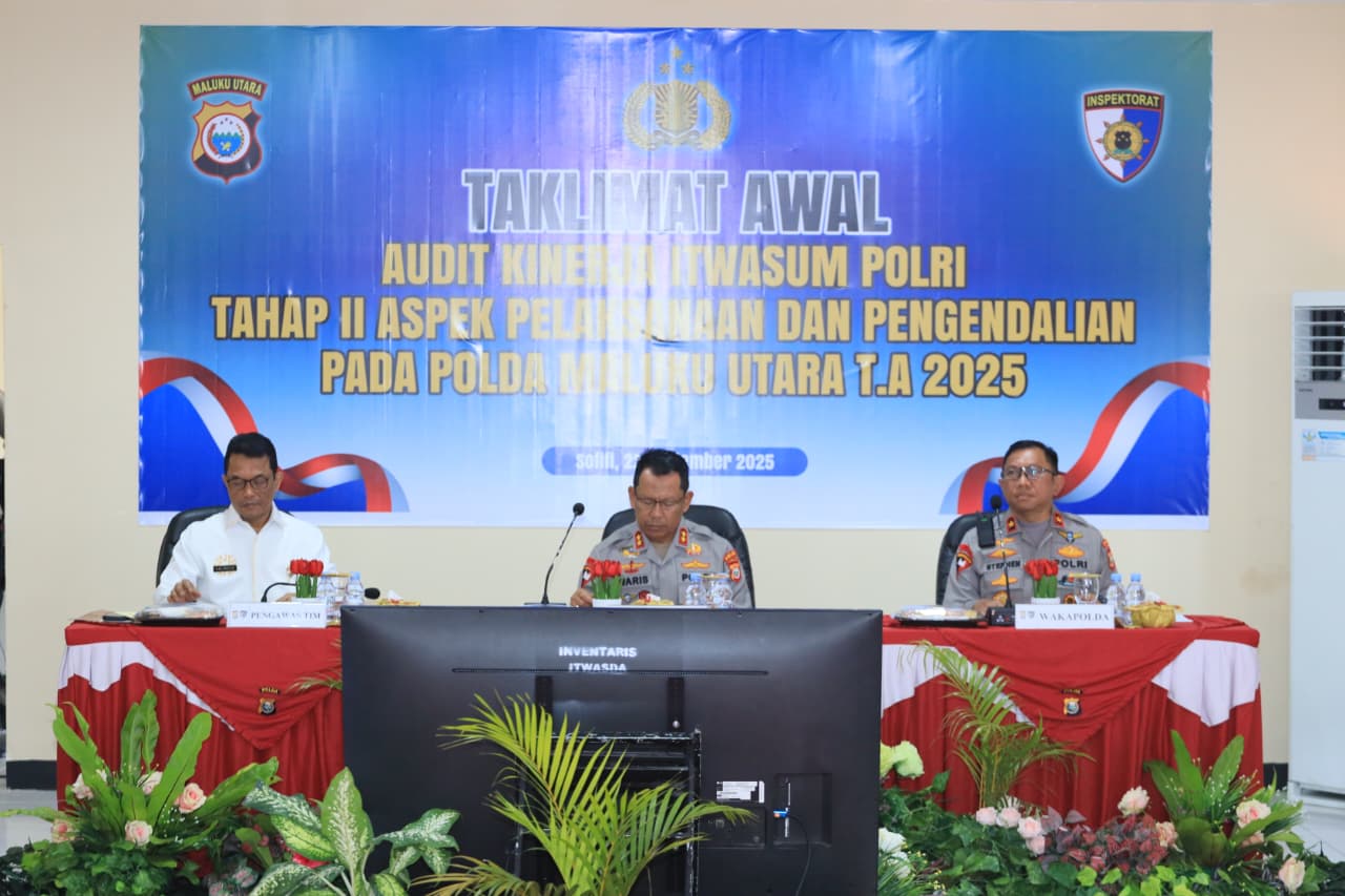 Kapolresta Tidore AKBP Heru Budiharto, S.I.K.,M.I.K. menghadiri kegiatan Taklimat Awal Audit Kinerja Itwasum Polri Tahap II Aspek Pelaksanaan dan Pengendalian yang digelar di Polda Maluku Utara. Kegiatan ini dibuka langsung oleh Kapolda Maluku Utara, Irjen Pol. Drs. Waris Agono, M.Si, serta dihadiri Wakapolda Maluku Utara, Brigjen Pol. Stephen M. Napiun, S.I.K., S.H., M.Hum., tim auditor Itwasum Polri, para Pejabat Utama Polda Maluku Utara, dan Kapolres/ta jajaran. Senin (22/9)