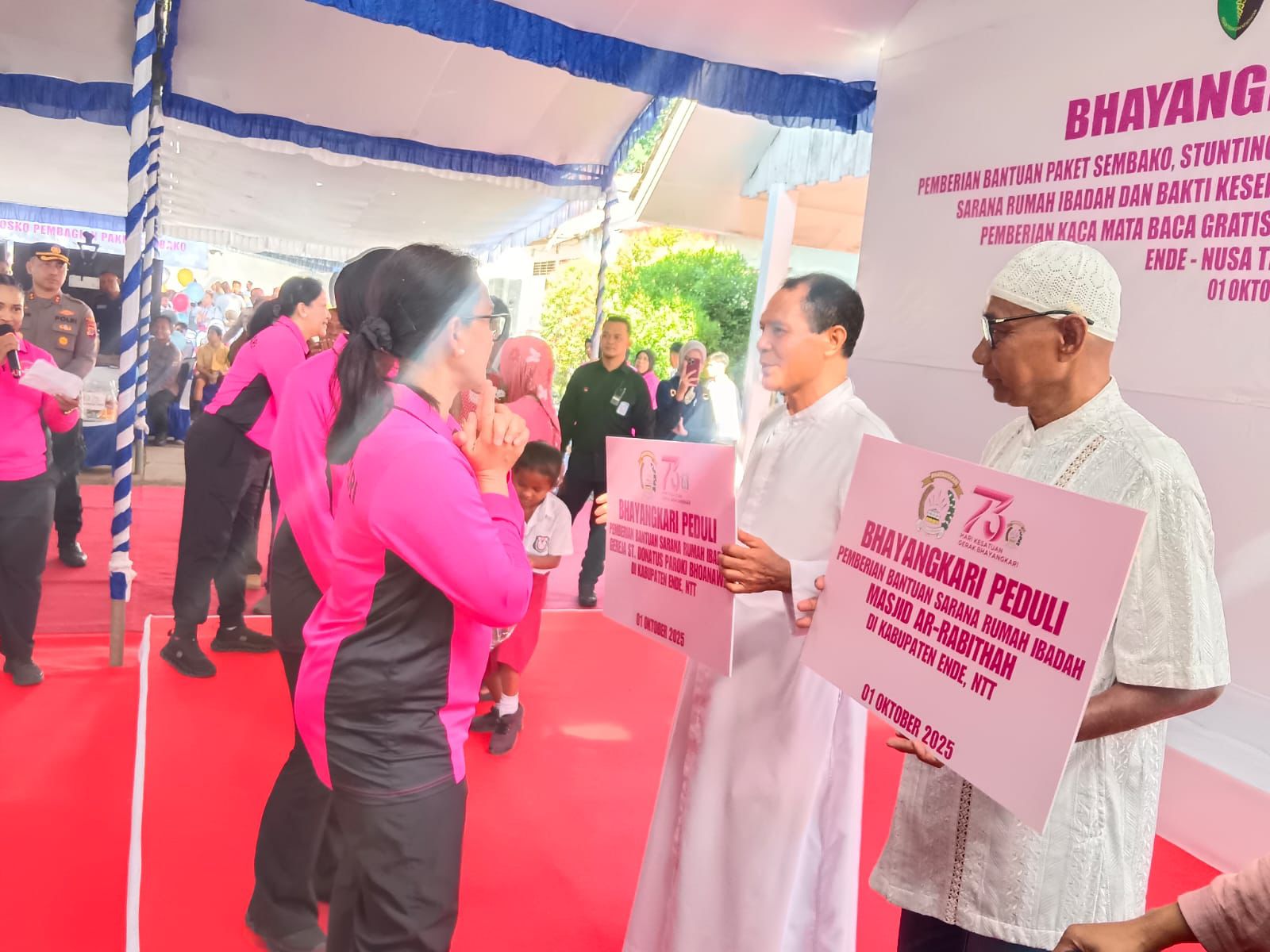 Ketua Umum Bhayangkari, Ny. Julianti Sigit Prabowo, melaksanakan rangkaian kegiatan Bhayangkari Peduli di Kabupaten Ende, Nusa Tenggara Timur, Rabu (1/10/2025). Kegiatan ini meliputi penyaluran bantuan sosial, bakti kesehatan, serta bakti religi yang dipusatkan di halaman Kantor Camat Ende Utara, Kelurahan Kota Raja, Kecamatan Ende Utara.