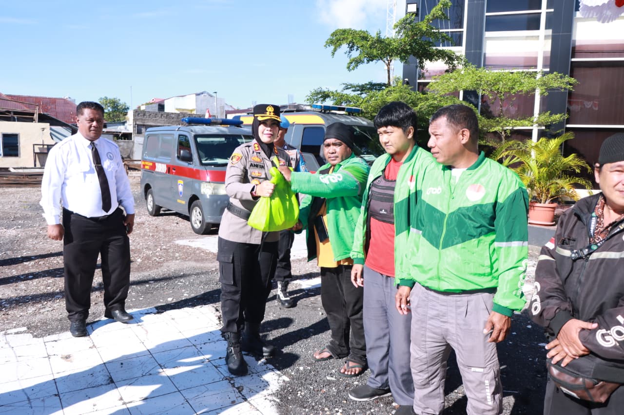 Dalam wujud nyata bakti dan kepedulian kepada masyarakat Kapolres Ternate AKBP Anita Ratna Yulianto, S.I.K., M.H. membagikan bantuan sosial (bansos) kepada 50 driver ojek online (ojol) di Mako Polres Ternate, Senin (20/10) kemarin.