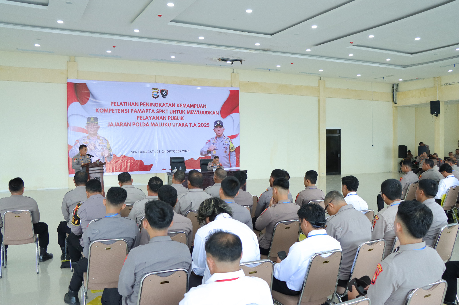 Guna meningkatkan kemampuan personel dalam menjaga situasi kamtibmas melalui patroli terarah dan kegiatan preventif di seluruh jajaran, Polda Maluku Utara menyelenggarakan Pelatihan Peningkatan Kemampuan Kompetensi Pamapta SPKT (Sentra Pelayanan Kepolisian Terpadu). Kegiatan ini dilaksanakan pada Kamis (23/10) kemarin, bertempat di SPN Polda Maluku Utara, Gurabati, Kec. Tidore Selatan, Kota Tidore Kepulauan.
