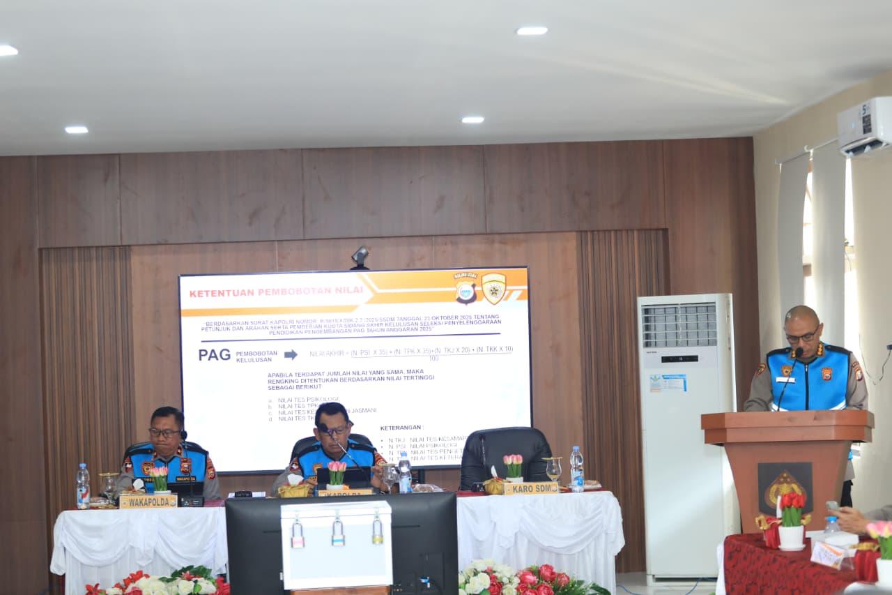 Polda Maluku Utara menggelar sidang kelulusan tingkat Panitia Daerah seleksi Pendidikan Alih Golongan (PAG) dari bintara ke perwira Polri dan seleksi Sekolah Bintara Polisi (SBP) dari tamtama ke bintara T.A. 2025/2026, yang berlangsung di ruang Rupatama Polda Malut Lt. 3 Gedung A, pada Jumat (24/10) kemarin.