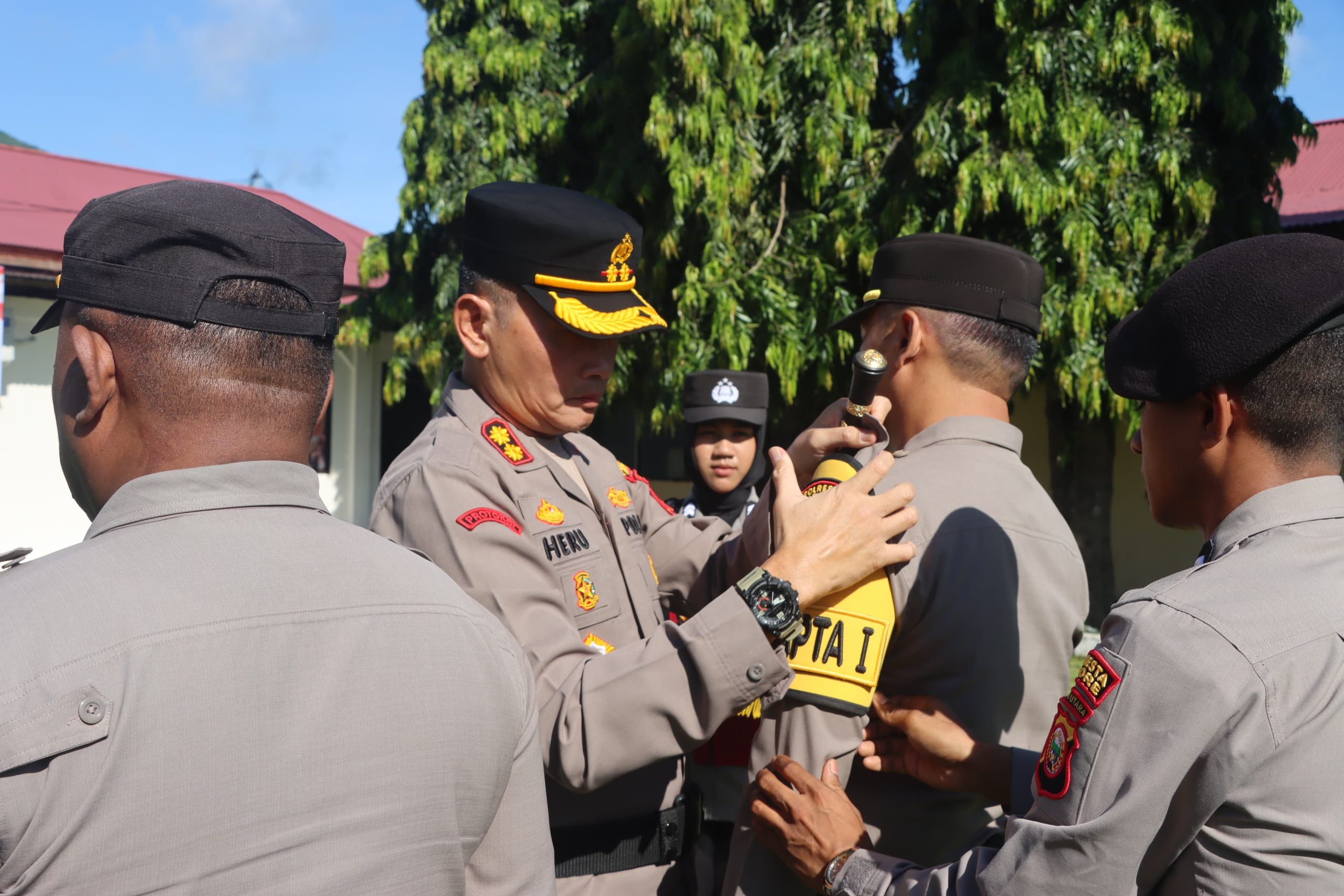Acara dilanjutkan dengan pemasangan ban lengan PAMAPTA dan rompi Tim Negosiator oleh Kapolresta Tidore sebagai simbol pengukuhan.