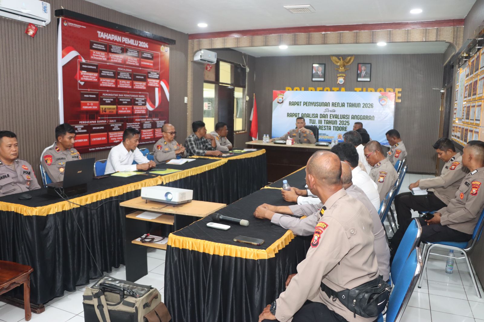 Tidore – Kepolisian Resor Kota (Polresta) Tidore menggelar Rapat Penyusunan Rencana Kerja (Renja) Tahun 2025 sekaligus Rapat Analisa dan Evaluasi (Anev) Anggaran Triwulan III Tahun 2025, bertempat di Rupatama Polresta Tidore, Senin (27/10/2025).