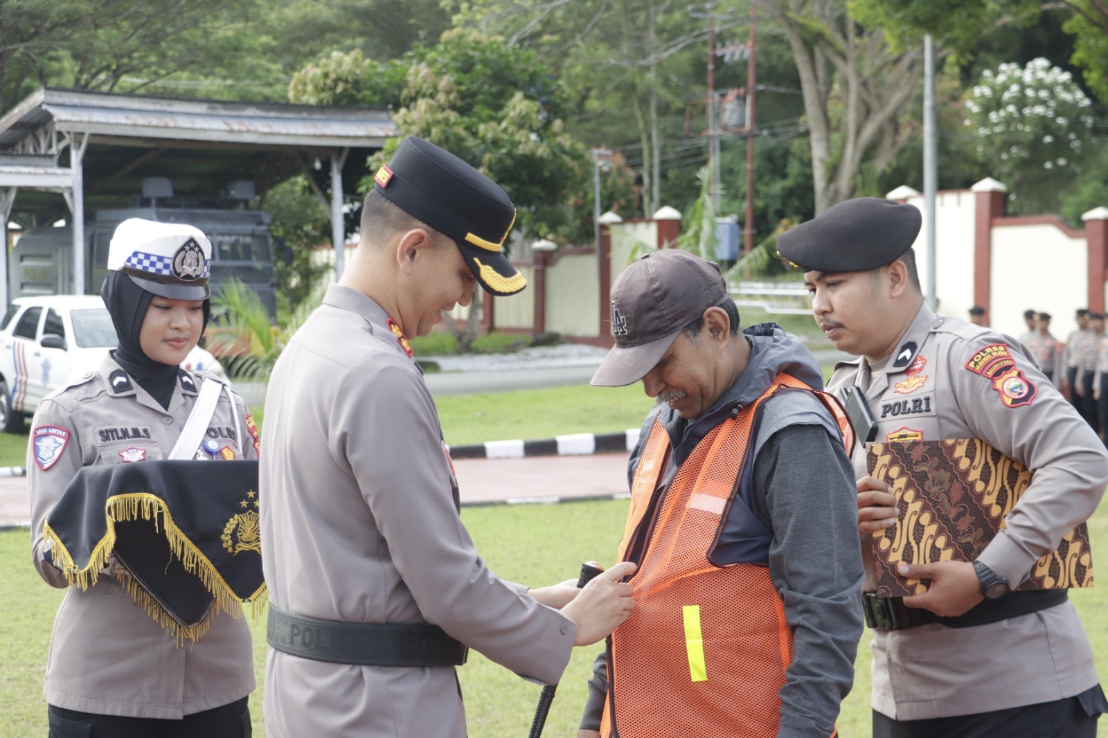 Kegiatan ini juga diisi dengan pemberian bantuan sosial berupa beras SPHP kepada perwakilan komunitas ojek sebagai bentuk kepedulian Polres Halsel, serta penempelan stiker layanan 110 pada kendaraan ojek sebagai sarana penyebaran informasi kepada masyarakat.