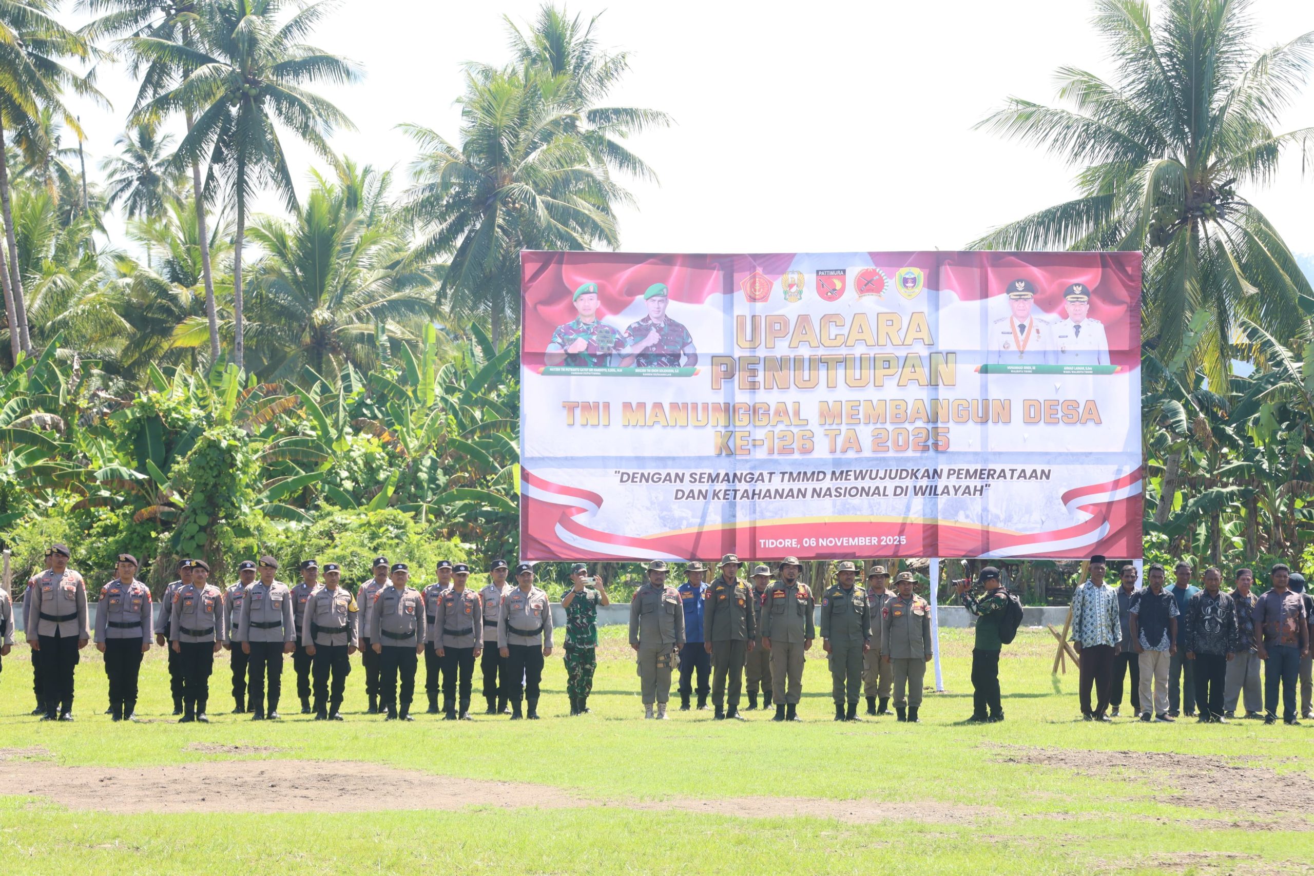 Kapolresta Tidore AKBP Heru Budiharto, S.I.K., M.I.K. menghadiri Upacara Penutupan TNI Manunggal Membangun Desa (TMMD) ke-126 Tahun Anggaran 2025 yang berlangsung di Lapangan Desa Wama, Kecamatan Oba Selatan, Kota Tidore Kepulauan, pada Kamis (06/11/2025).