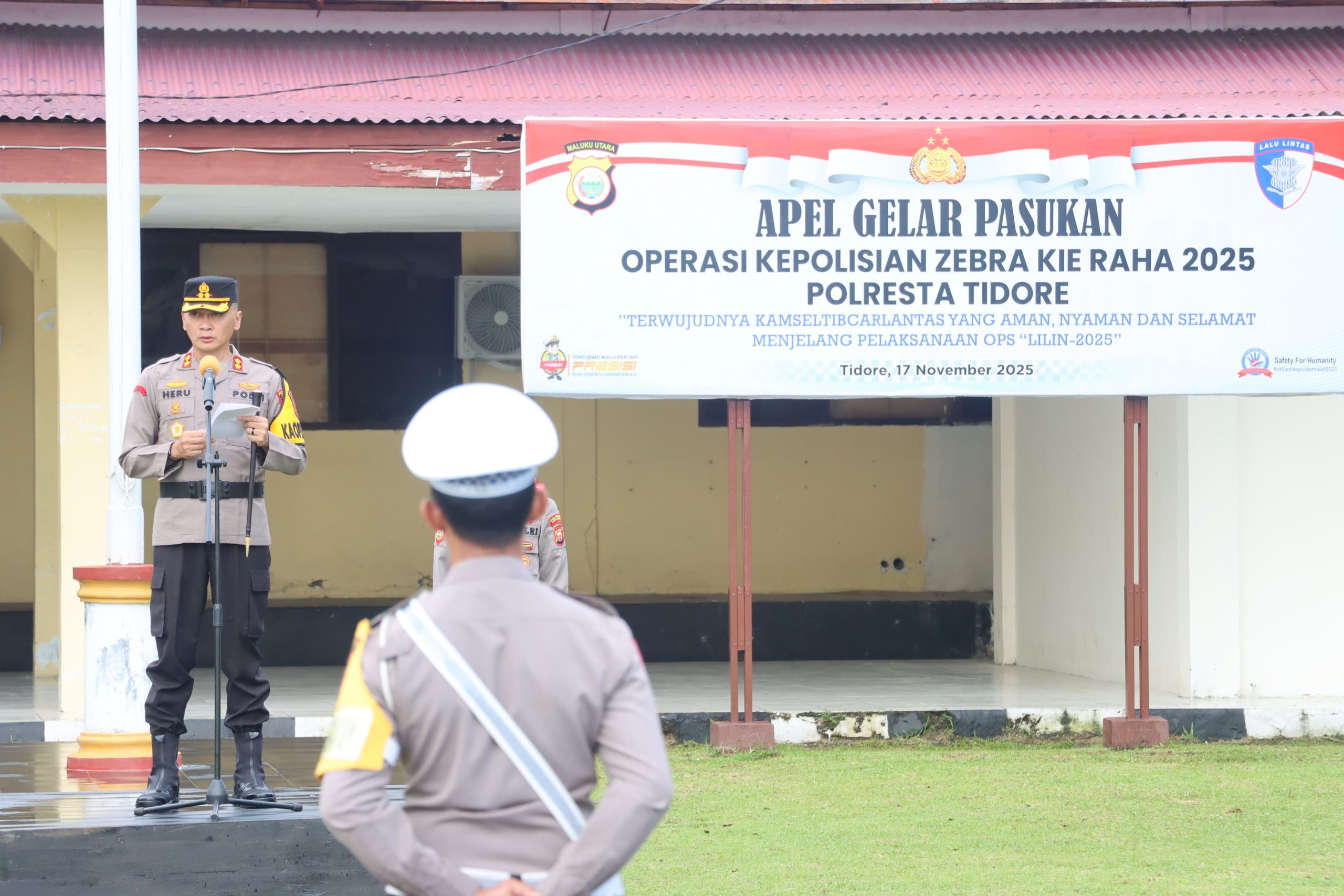 Polresta Tidore melaksanakan Apel Gelar Pasukan dalam rangka Operasi Kepolisian Mandiri Kewilayahan Zebra Kie Raha 2025 yang dipimpin langsung oleh Kapolresta Tidore AKBP Heru Budiharto, S.I.K., M.I.K. Kegiatan berlangsung di Lapangan Apel Polresta Tidore, Senin (17/11/2025).